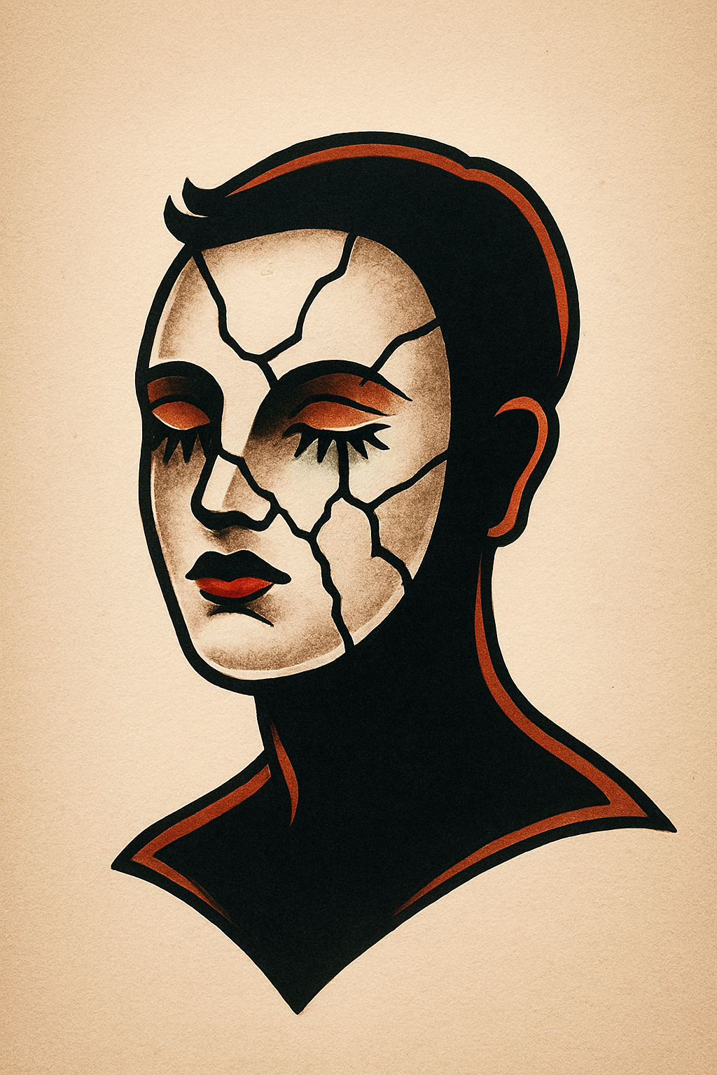 Stylized Woman Holding a Cracked Mask in Artistic Tattoo Style