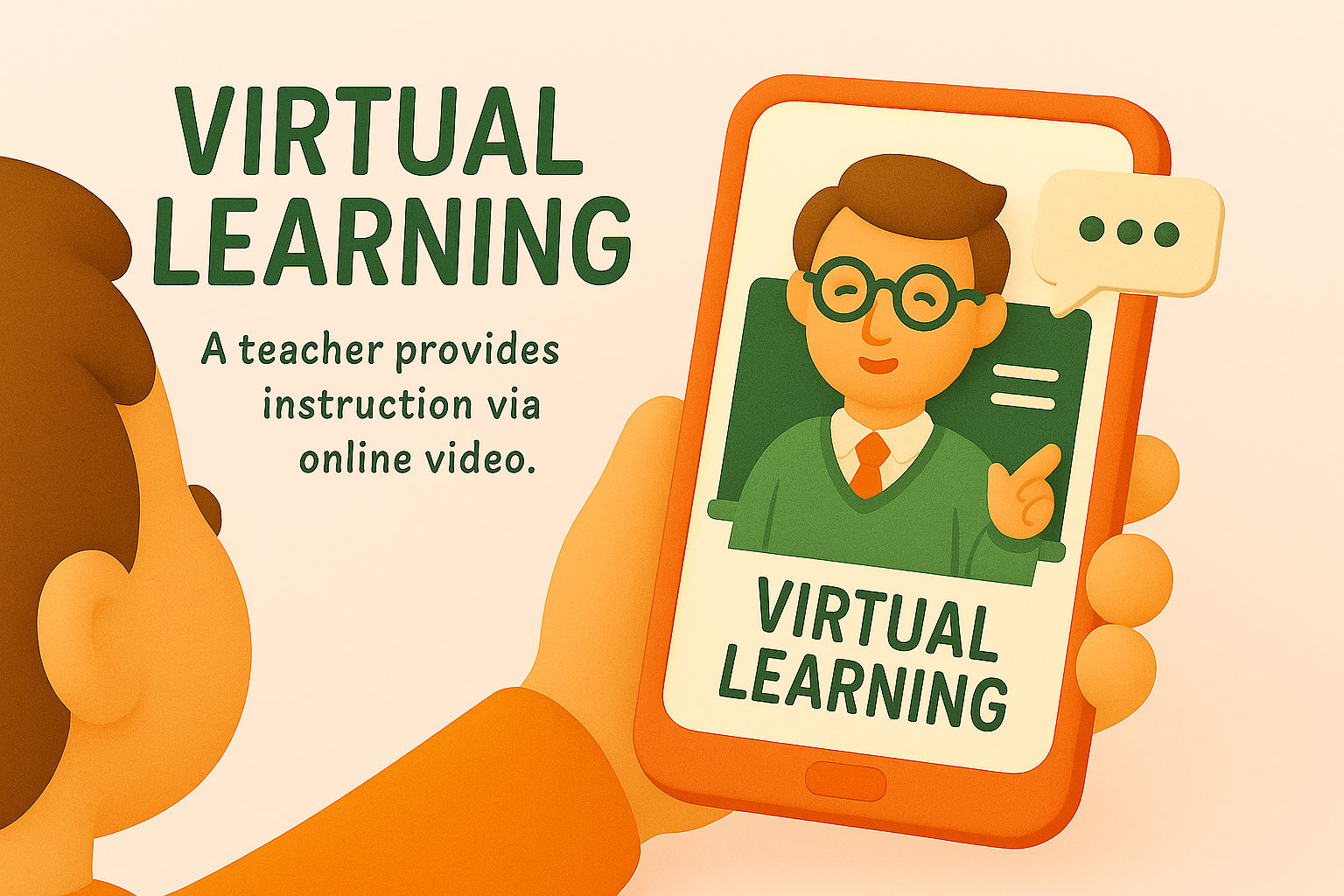 A colorful illustration highlighting the concept of virtual learning, featuring a character on a smartphone screen. Ideal for educational content and online learning promotions.