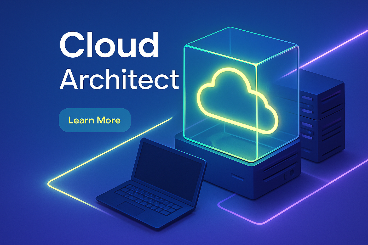 /Collection: /by davooda/Type: PNG/A visually striking representation of a Cloud Architect concept featuring a glowing cloud inside a glass structure, surrounded by a laptop and server components, all set against a vibrant blue background.