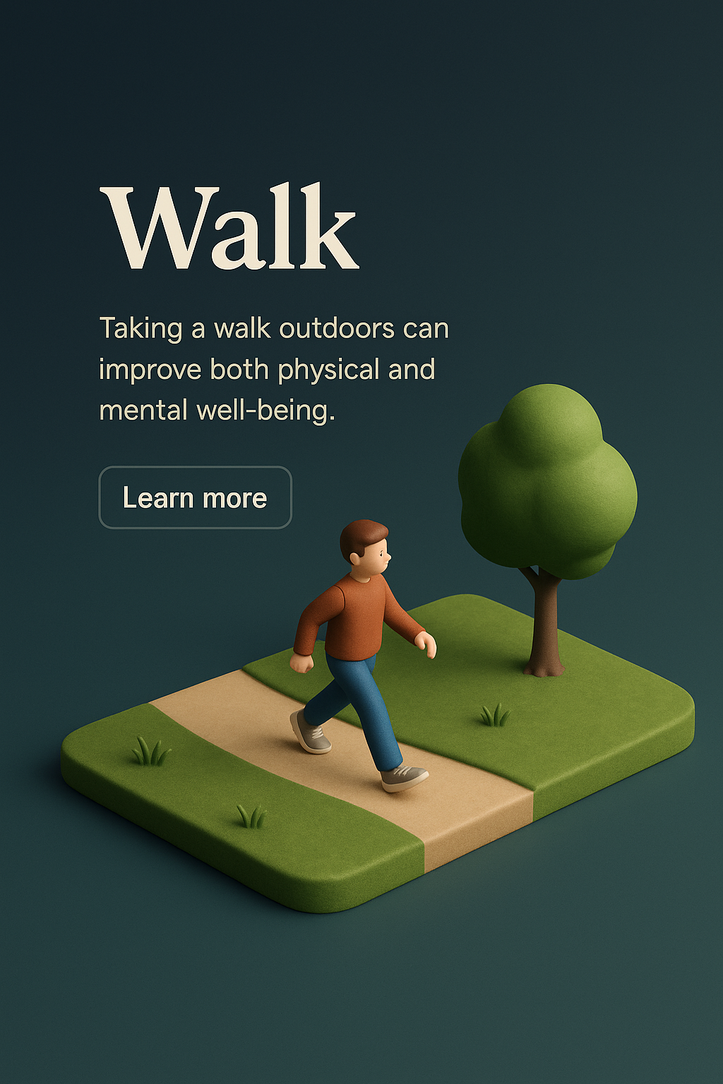 /Collection: /by davooda/Type: PNG/A stylized 3D scene featuring a person walking along a path in a grassy area. The background is dark with a smooth gradient, enhancing the visual appeal of the character and tree.