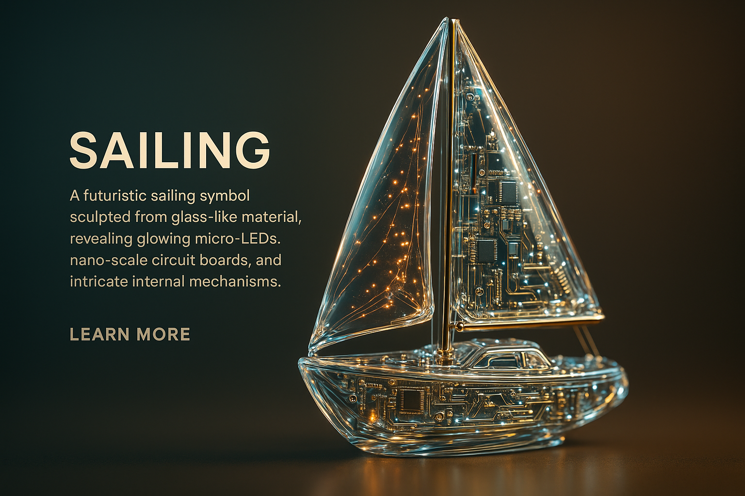 /Collection: /by davooda/Type: PNG/A striking hyperrealistic sculpture of a sailing symbol, crafted from glass-like materials, showcasing intricate internal circuits and glowing elements. Soft lighting enhances the reflections.