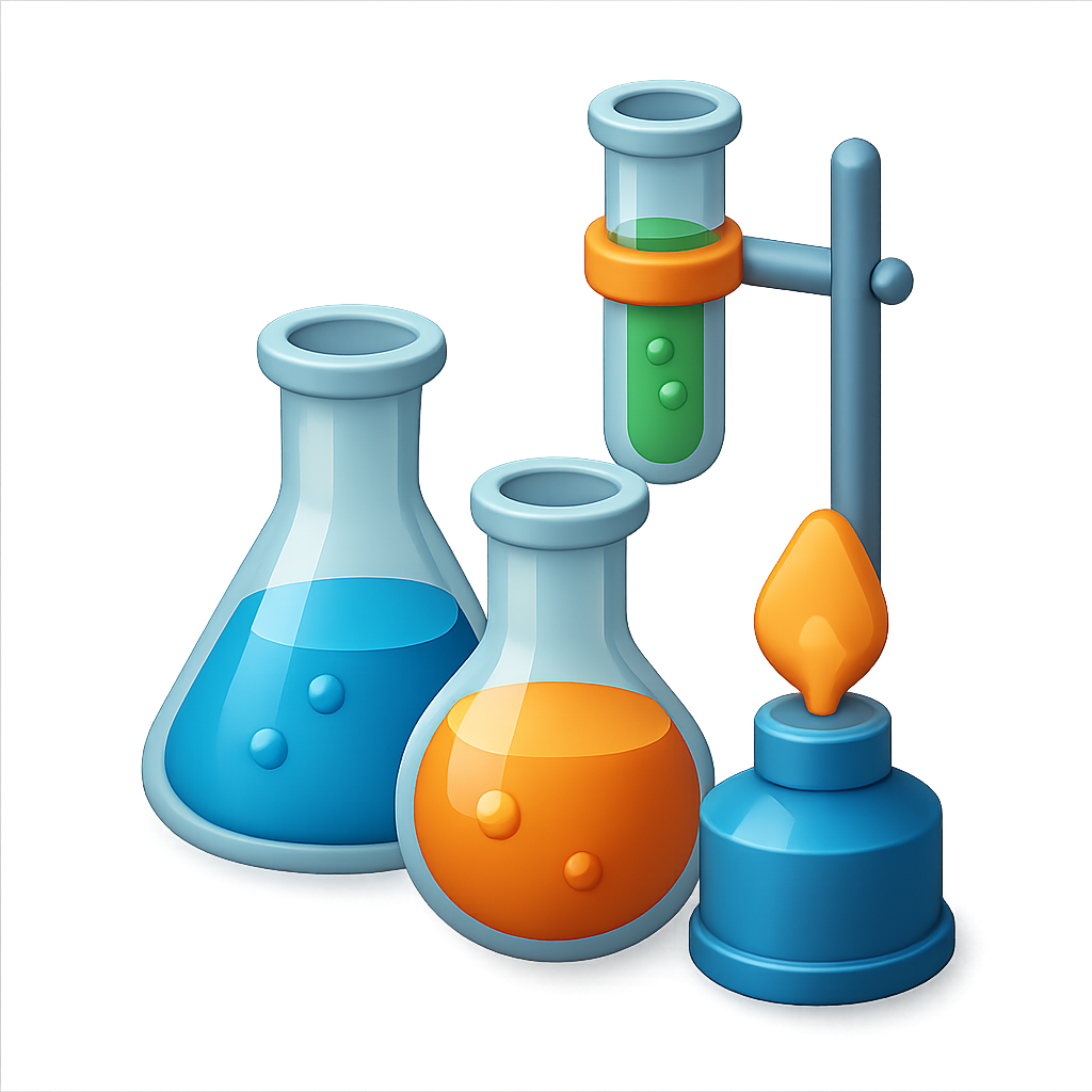 /Collection: /by davooda/Type: PNG/A vibrant 3D illustration of laboratory equipment, featuring flasks and a Bunsen burner with colorful liquids. The design has a transparent background and a three-quarter isometric view.