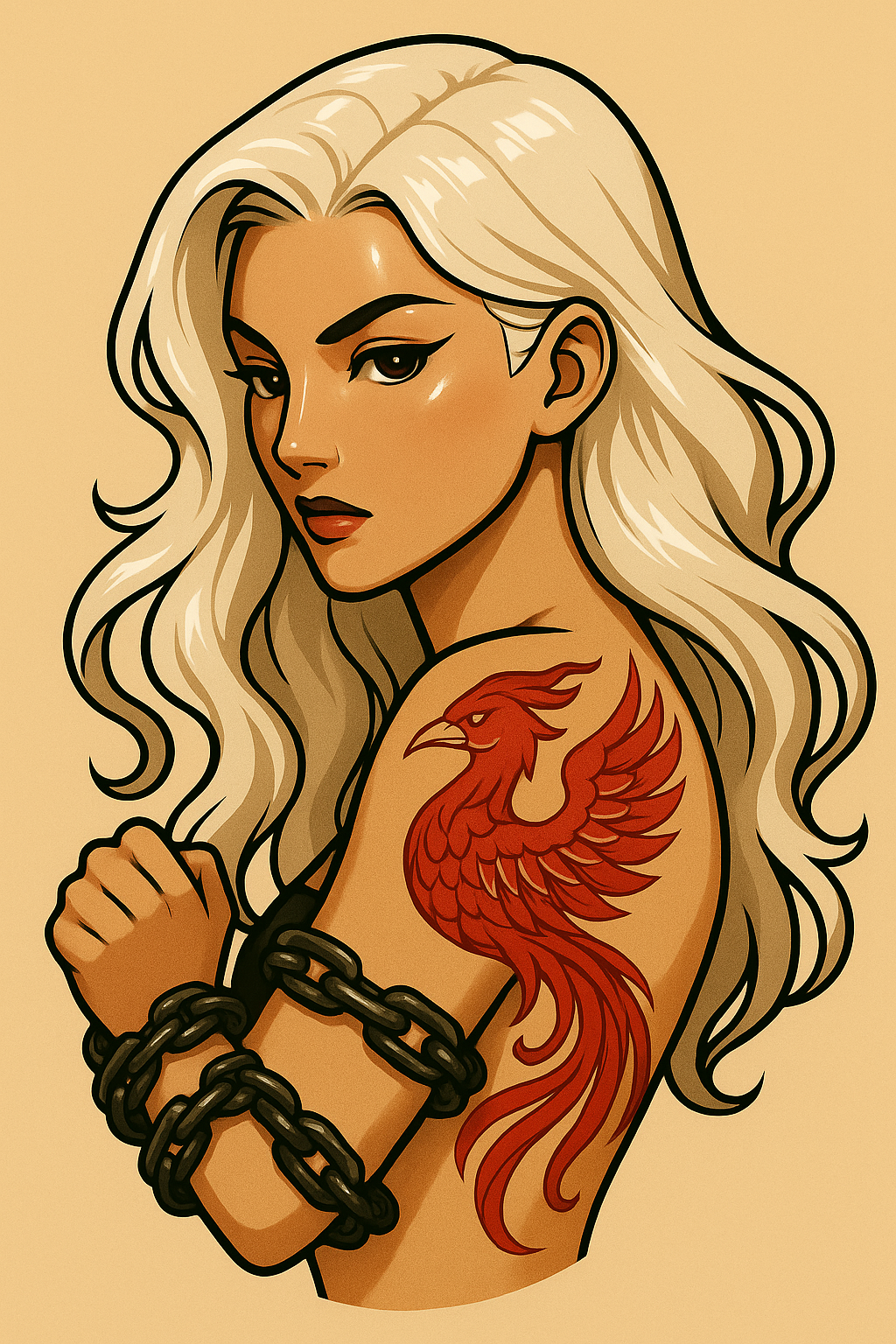 A striking illustration of a woman with white hair and a vibrant phoenix tattoo on her shoulder. She is depicted with chains around her wrists, set against a soft beige background.