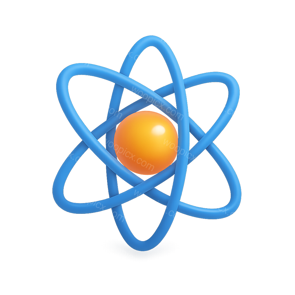 /Premium/Collection: /by davooda/Type: PNG/A 3D representation of a Higgs boson particle featuring a central orange sphere surrounded by blue atomic orbits. The design is isometric with a transparent background, emphasizing a modern, volumetric look.