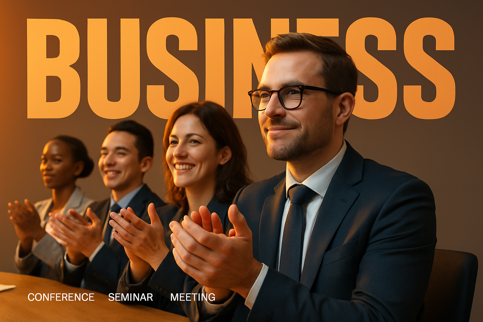 /Collection: /by davooda/Type: PNG/A group of four individuals applauding during a business meeting, set against a minimalistic gradient background. The word 'BUSINESS' dominates the upper half, creating a striking visual impact.