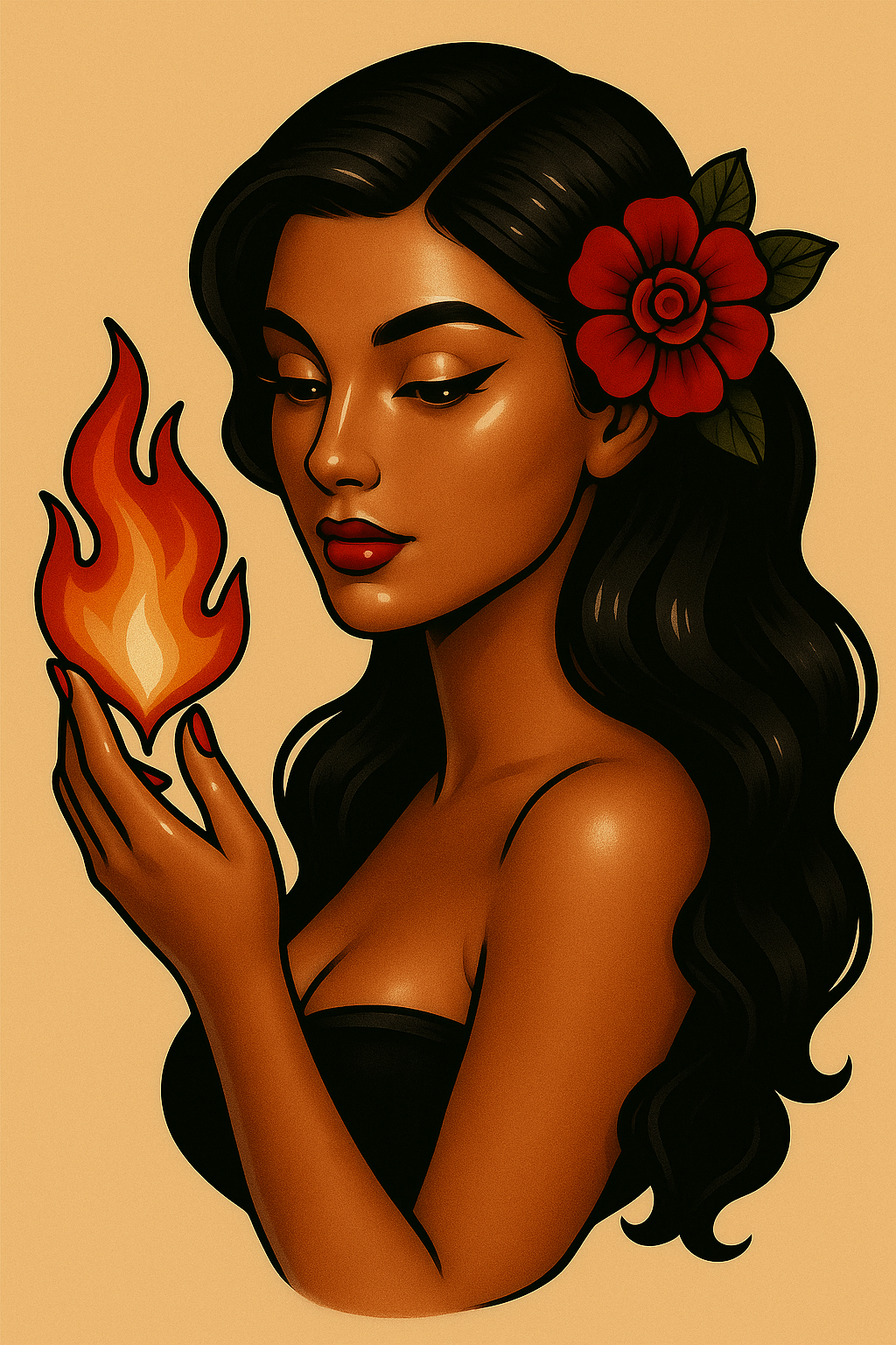 /Collection: /by davooda/Type: PNG/An artistic representation of a woman holding flames in one hand and a rose in her hair. The design features glossy, vibrant colors and a smooth, tattoo-like composition on a beige background.