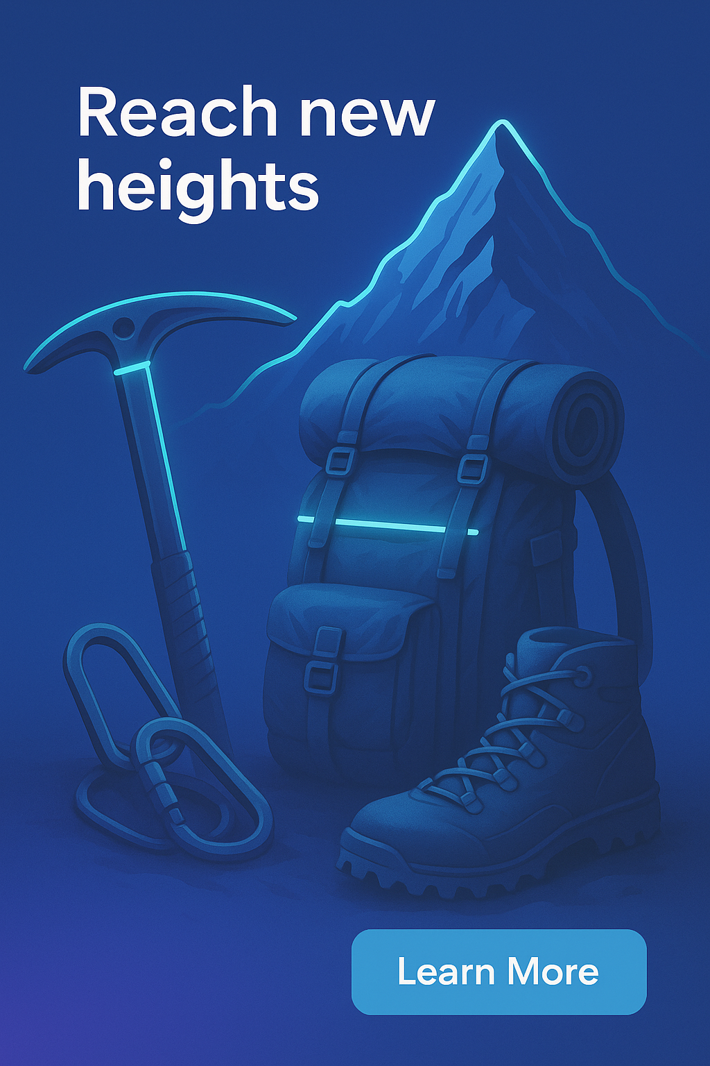 A vibrant composition featuring essential mountain climbing gear including an ice axe, backpack, climbing carabiner, and boot, all set against a solid blue background with neon highlights.
