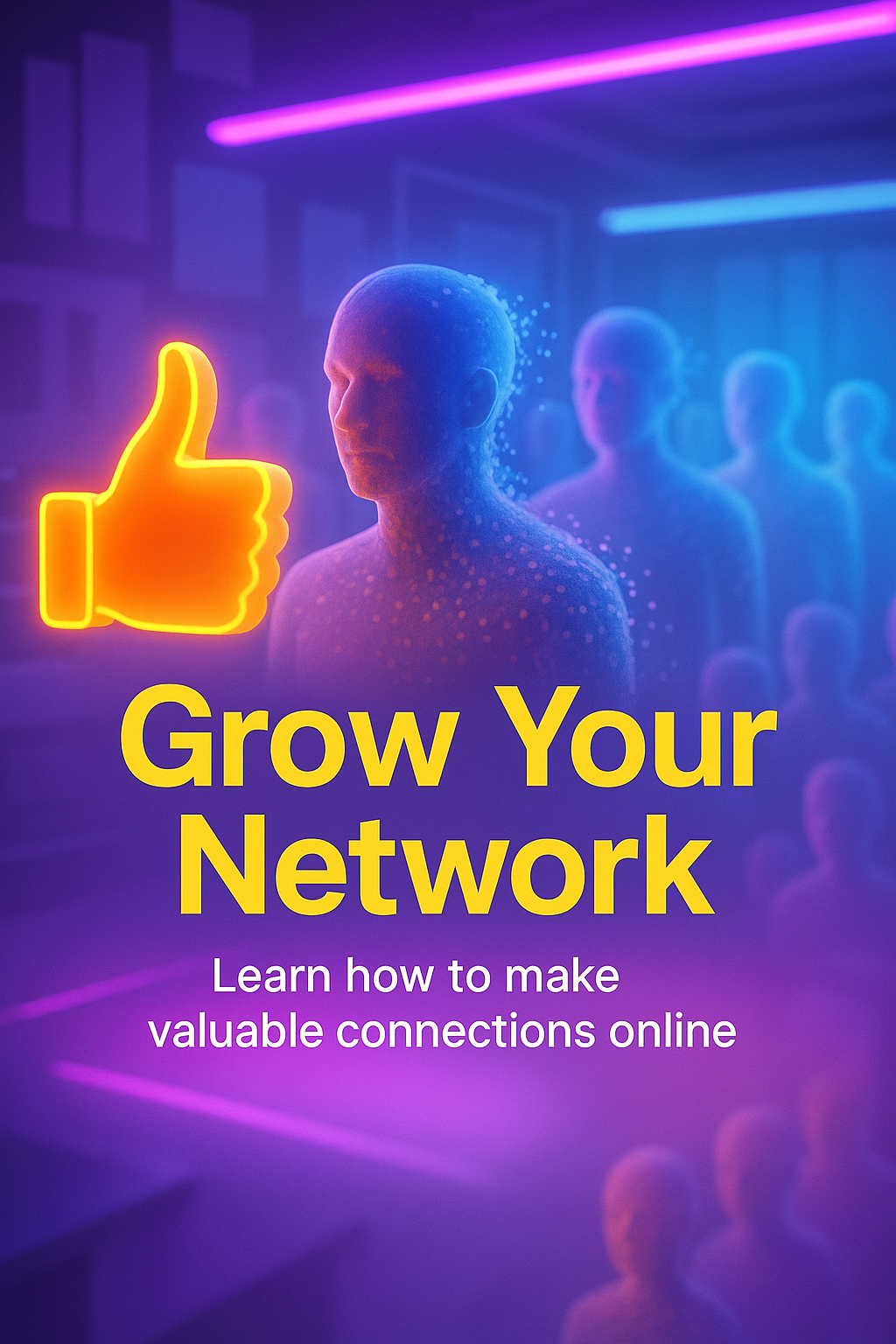/Collection: /by davooda/Type: PNG/Vibrant social media graphic featuring a glowing thumbs-up symbol and stylized human figures, designed to promote online networking and connection-building strategies.