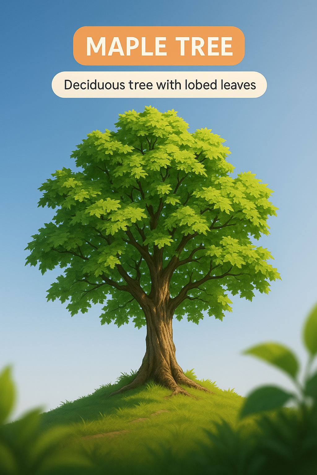 A vibrant illustration of a maple tree showcasing its lobed leaves and rich green foliage. Ideal for educational content about trees or nature.