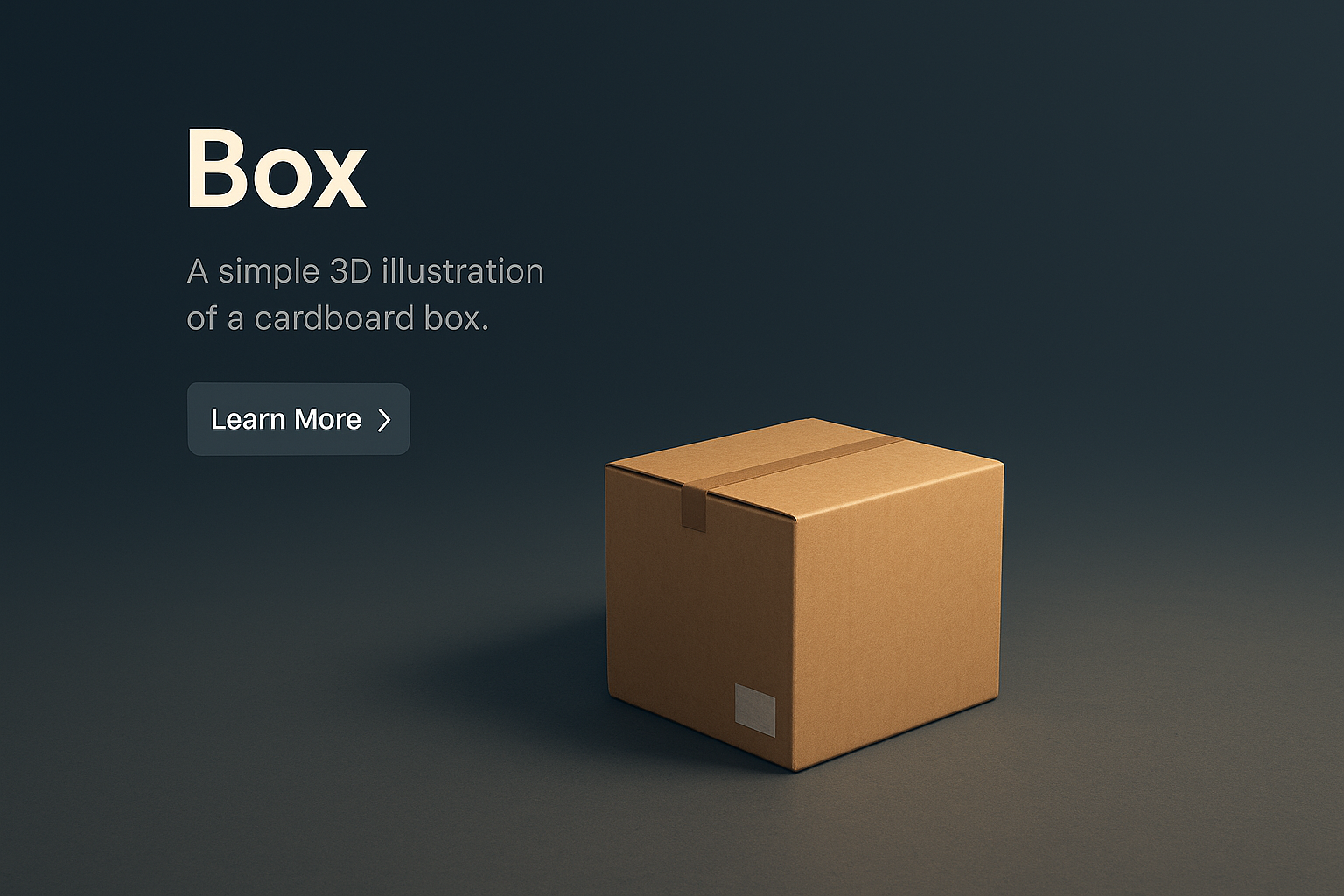 /Collection: /by davooda/Type: PNG/A detailed 3D scene featuring a cardboard box on a dark gradient background. The design includes minimal text and a call-to-action button, showcasing a clean and modern aesthetic.