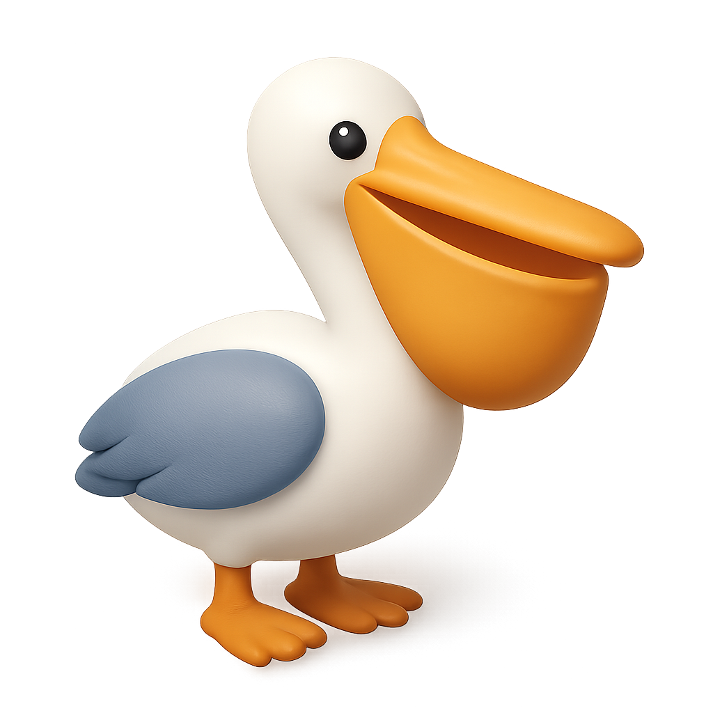 /Collection: /by davooda/Type: PNG/A stylized 3D pelican icon featuring a large orange pouch, blue wings, and a friendly expression. The design is isometric with a transparent background, showcasing a playful and modern aesthetic.