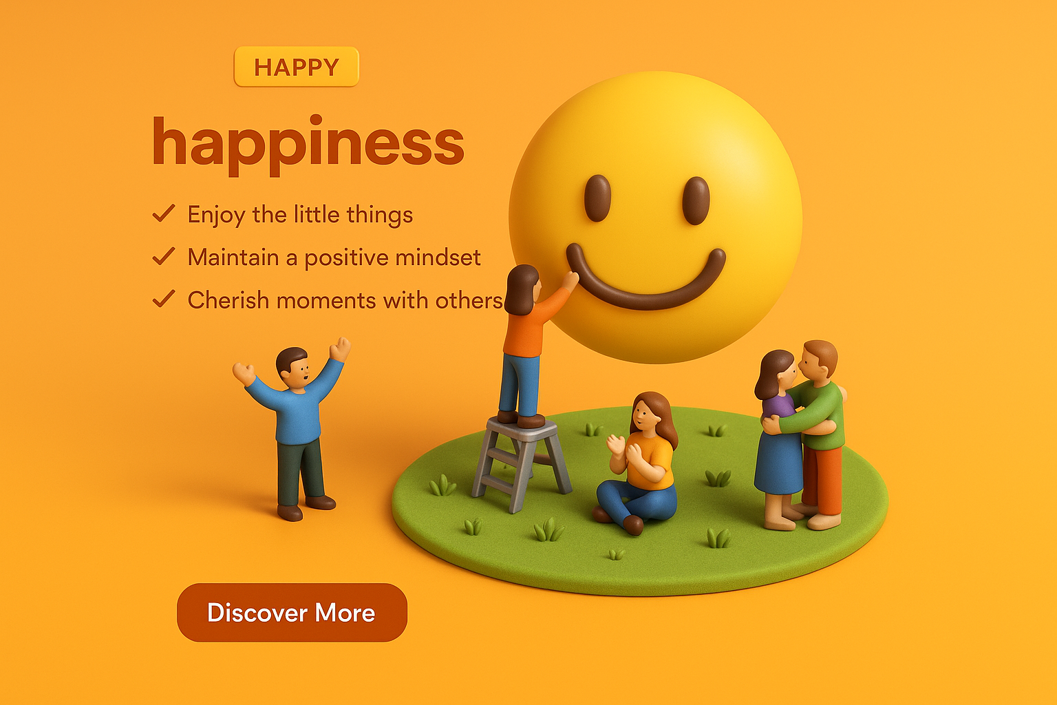 /Collection: /by davooda/Type: PNG/A vibrant 3D illustration depicting small characters celebrating happiness with a large smiley face. The scene conveys positivity and connection, set against a warm orange background.