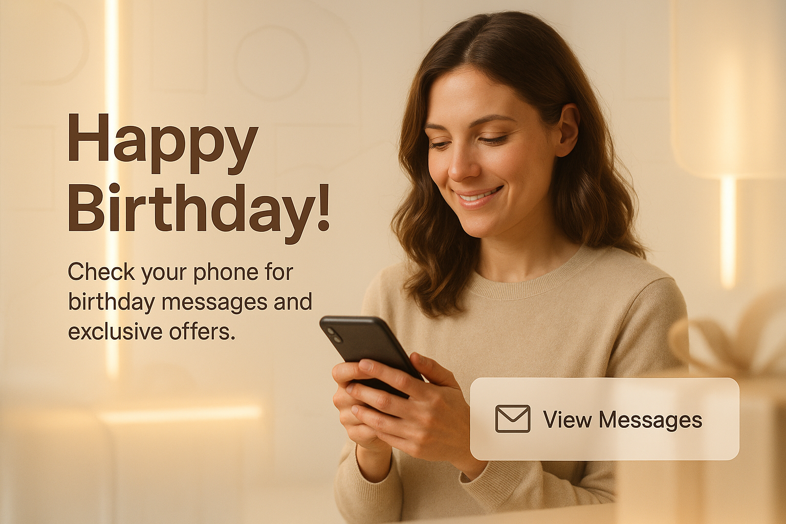 /Collection: /by davooda/Type: PNG/A warm and inviting birthday notification graphic showcasing a woman interacting with her phone. Ideal for digital marketing campaigns aimed at personal celebrations and special offers.