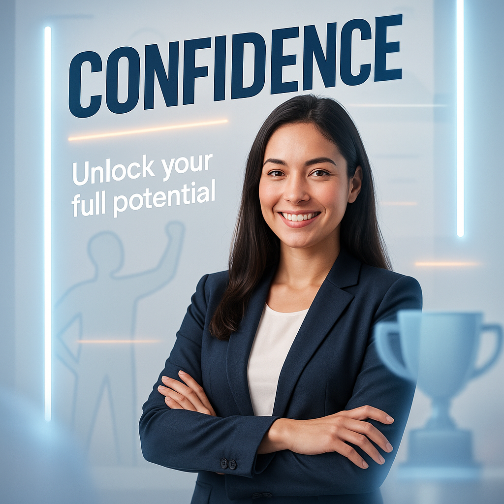 /Collection: /by davooda/Type: PNG/A motivational graphic featuring a confident professional woman with a trophy, designed to inspire personal growth and self-assurance. Suitable for coaching, workshops, or personal development branding.