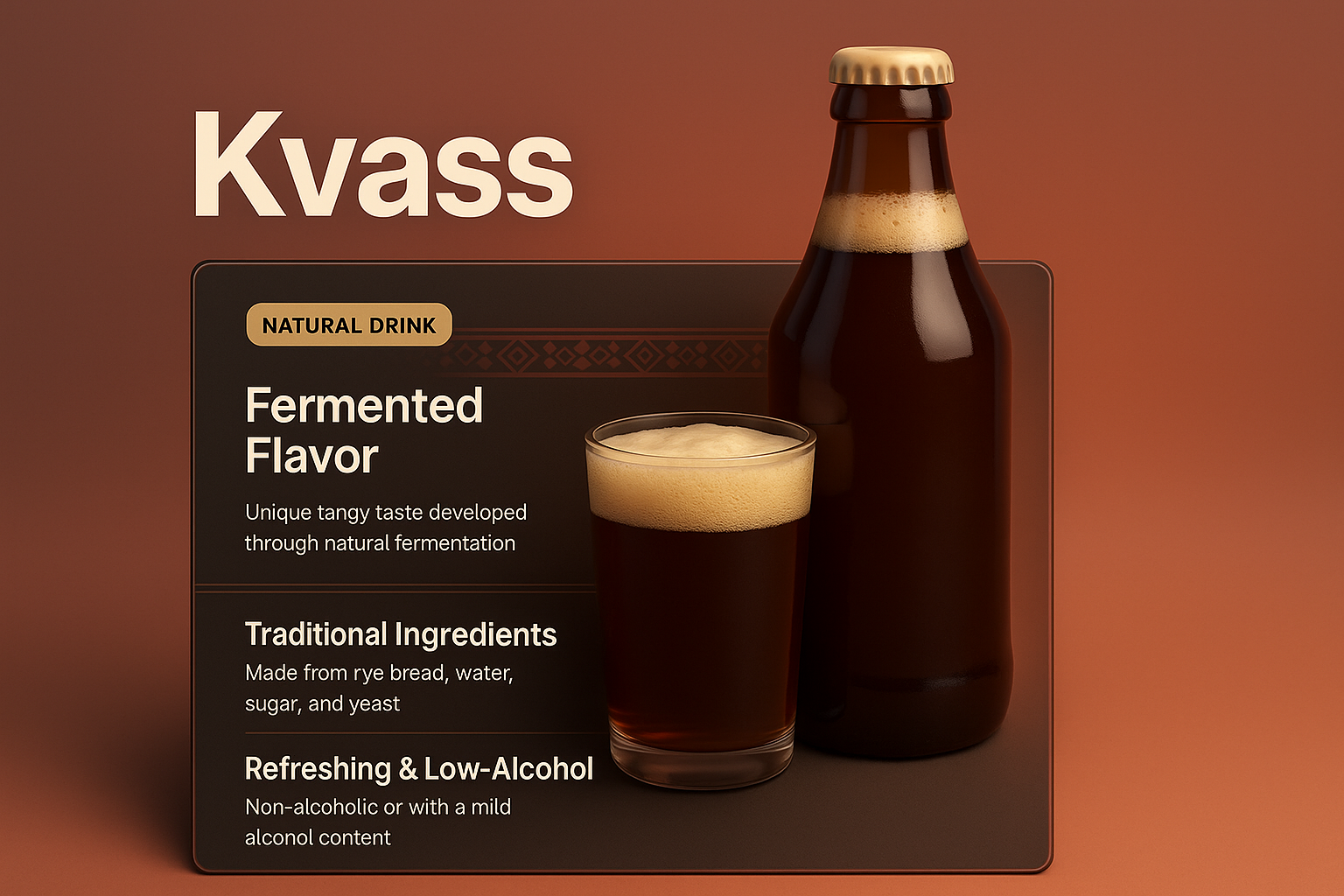 A 3D illustration showcasing kvass in a bottle and glass, along with a dark label featuring key features. The design integrates smooth gradients and a cohesive layout.