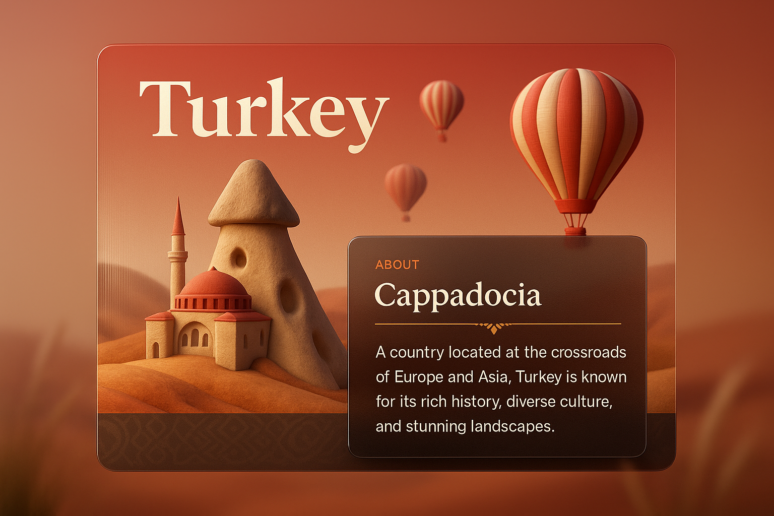 A captivating 3D illustration showcasing Cappadocia, Turkey, featuring unique rock formations, hot air balloons, and a rich cultural backdrop.
