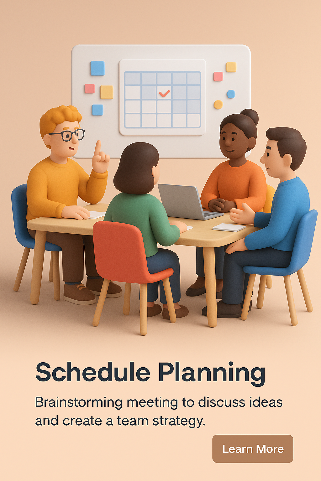 /Collection: /by davooda/Type: PNG/A realistic 3D illustration depicting a diverse group of creative individuals engaged in a brainstorming session for schedule planning. The scene is zoomed out, showing a collaborative environment with text elements.