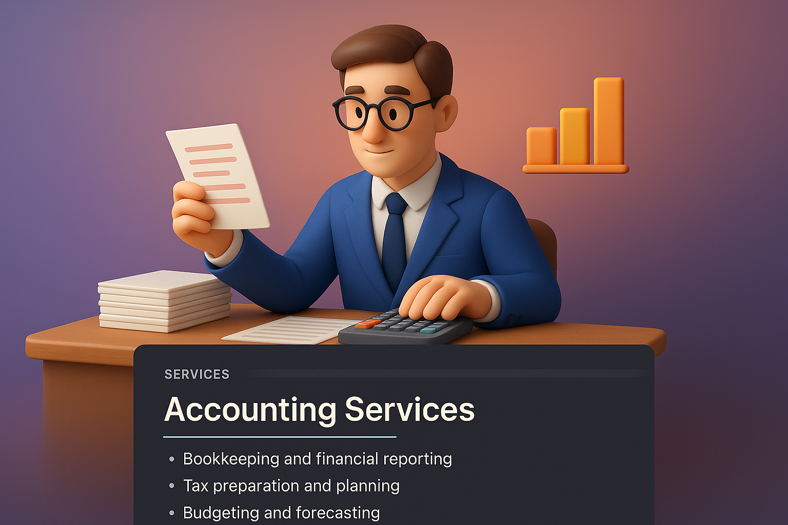 A vibrant 3D illustration of an accountant in a suit, sitting at a desk with documents and a calculator. The background features a smooth gradient, enhancing the professional theme.