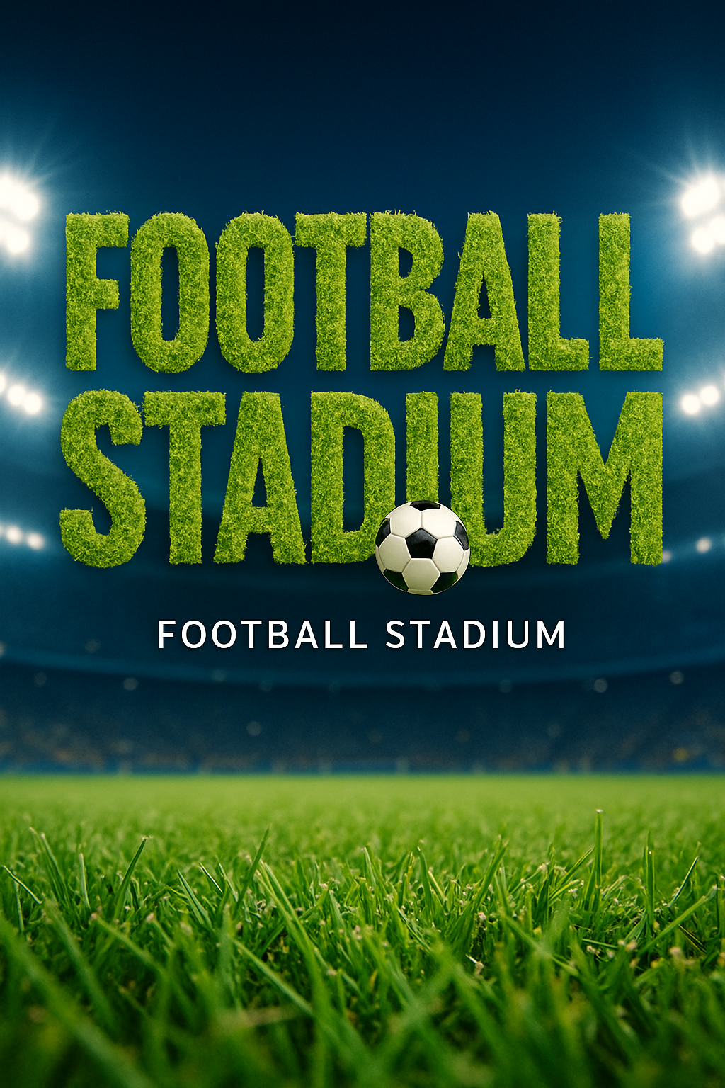 Vibrant graphic showcasing a football stadium theme with bold typography and a soccer ball, ideal for sports-related marketing and promotional materials.