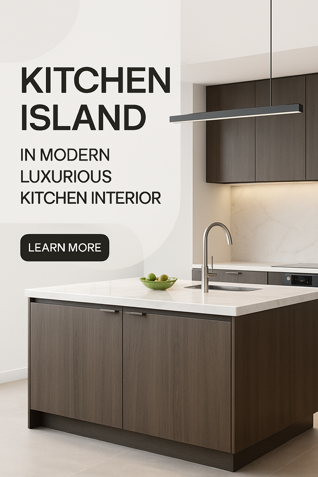 /Collection: /by davooda/Type: PNG/This image showcases a sleek kitchen island in a modern luxurious kitchen. The design emphasizes clean lines, geometric shapes, and a well-lit interior, complemented by bold typography.