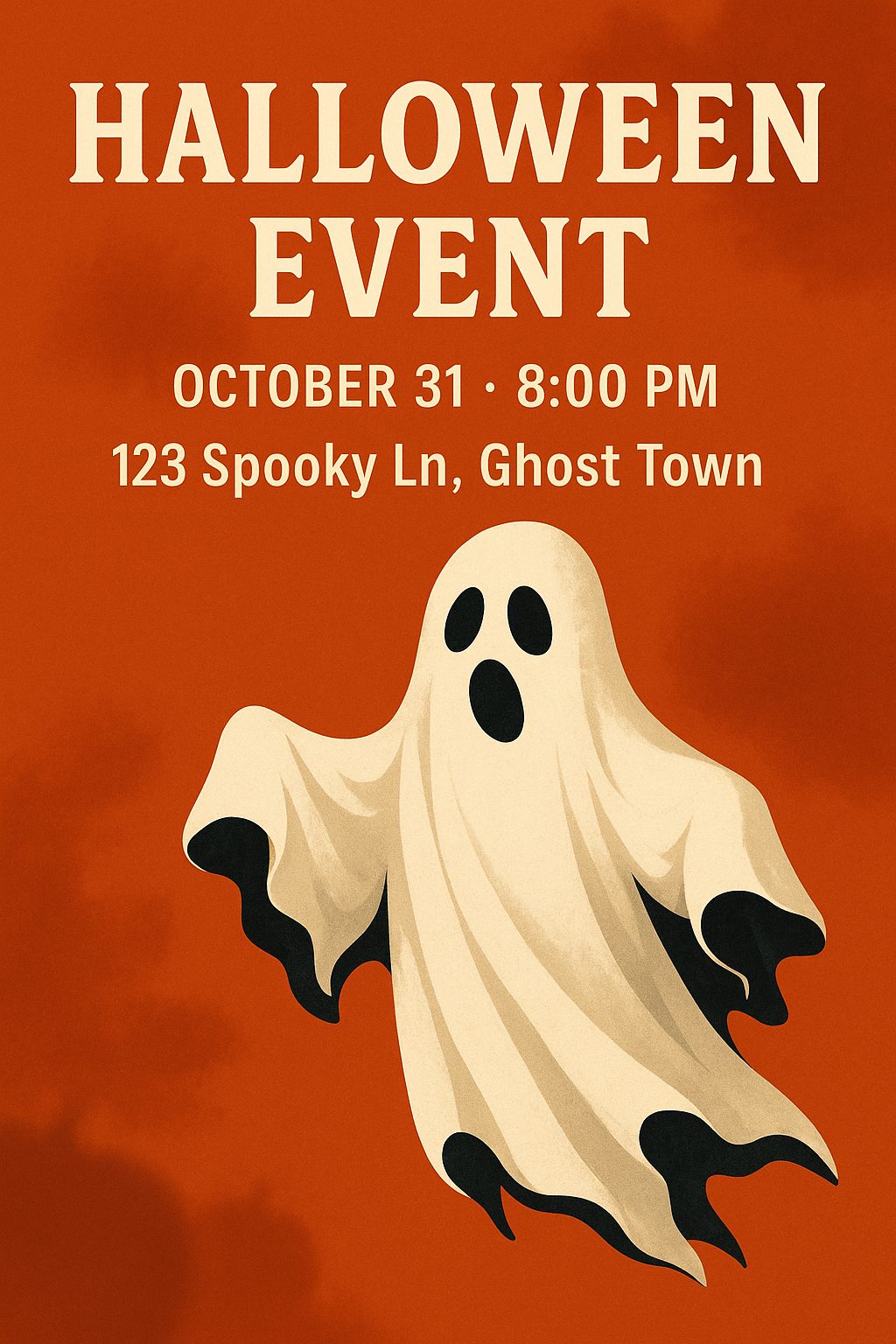 /Collection: /by davooda/Type: PNG/Vibrant Halloween event poster featuring a playful ghost illustration against a bold orange background, designed for promoting festivities with clear event details.
