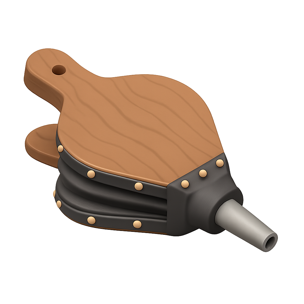 A detailed 3D icon of a bellows, viewed from a three-quarter angle. The design features a wooden texture with metallic accents, showcasing a volumetric and isometric style.