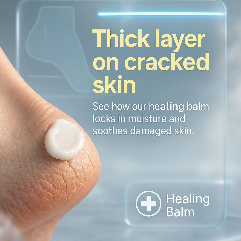 Informative promotional image showcasing a thick layer of healing balm applied to cracked skin, designed to highlight product benefits for skin care.