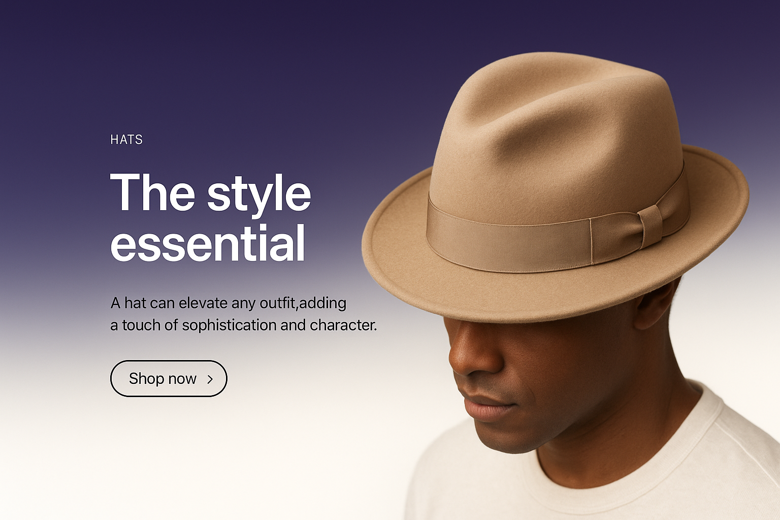 A modern web design showcasing a sophisticated hat against a two-color gradient background. The minimalistic layout emphasizes elegance and readability.