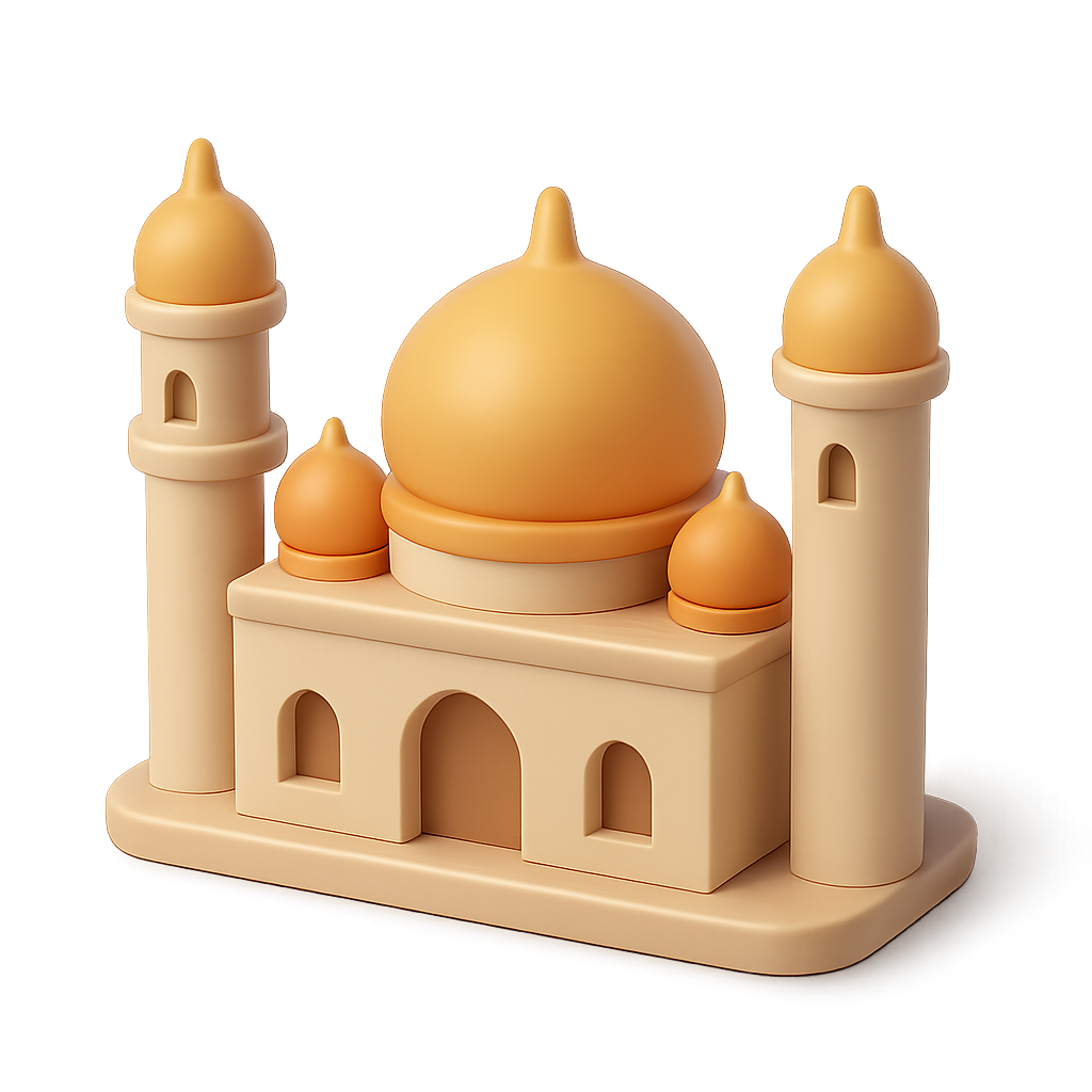 A stylized 3D mosque icon featuring a central dome and two towers, all in soft, light colors. The design has a three-quarter view and a smooth, isometric feel.