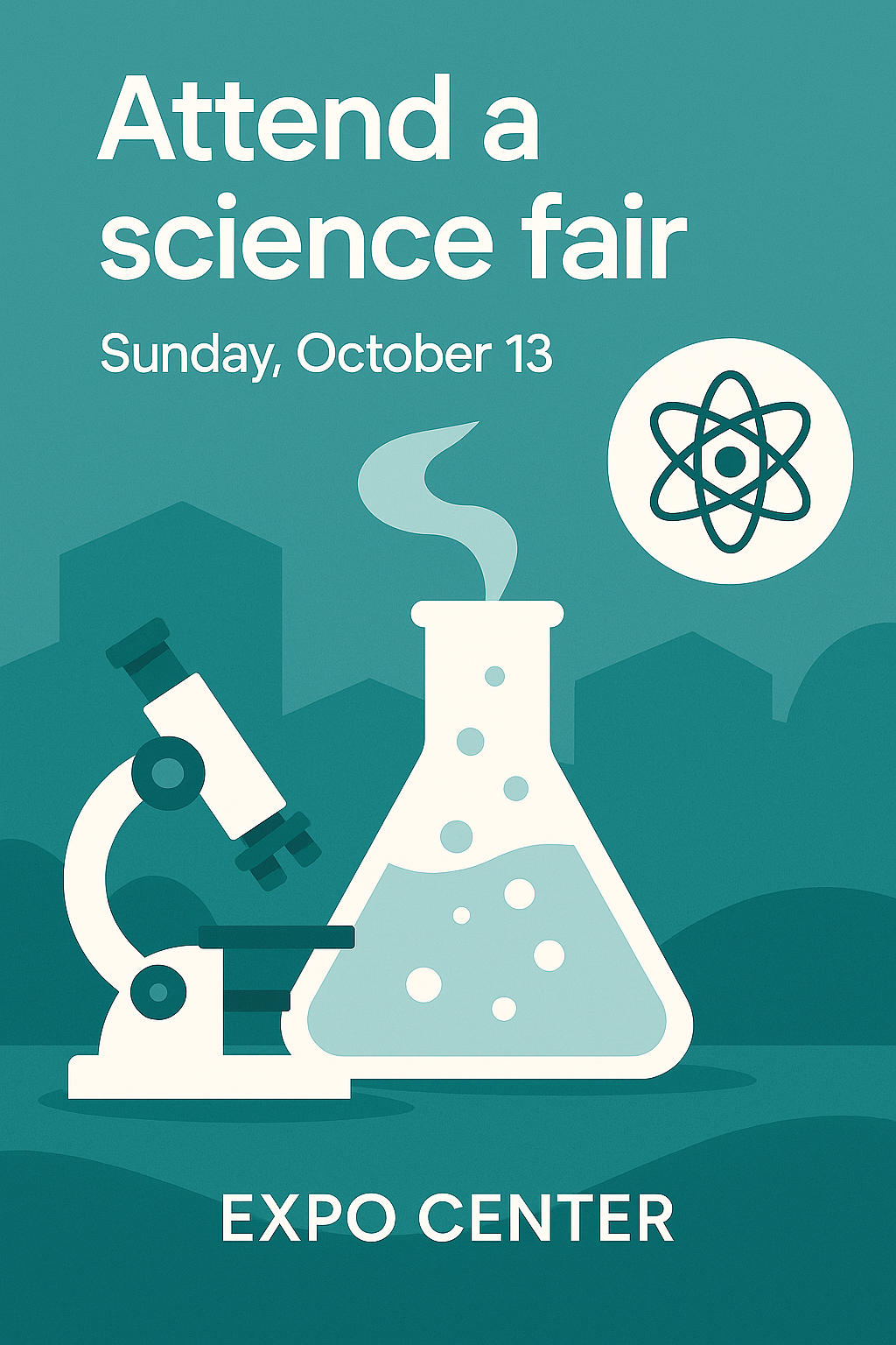 Informative promotional poster for a science fair, featuring a microscope and a laboratory flask in a modern flat design. Ideal for educational events and community engagement.