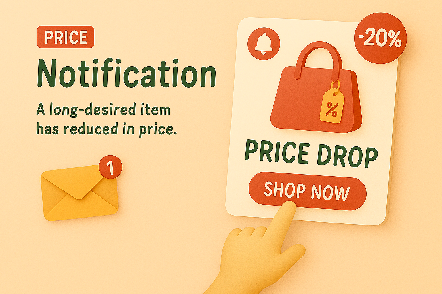 Vibrant promotional graphic featuring a price drop alert with a shopping bag icon and call-to-action button, ideal for e-commerce notifications.