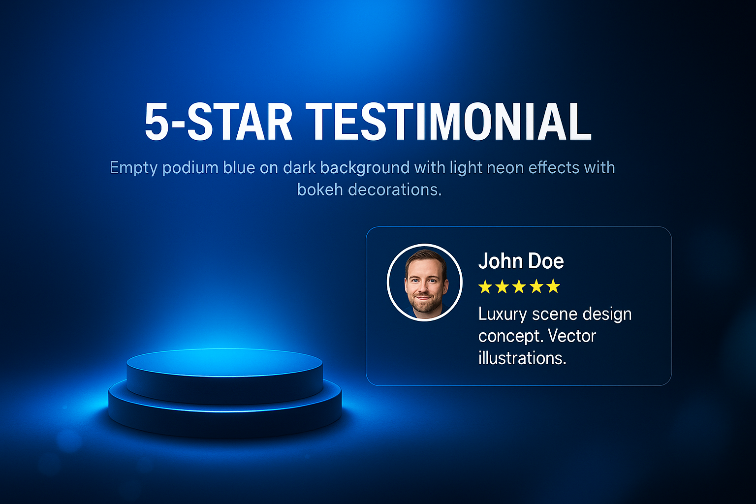 /Collection: /by davooda/Type: PNG/A captivating design featuring an empty blue podium on a dark background, illuminated by light neon effects and bokeh decorations, highlighting a 5-star testimonial.