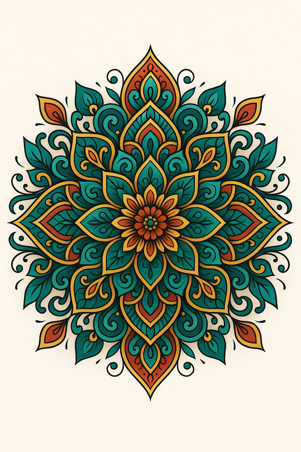 A beautifully detailed mandala illustration featuring a harmonious blend of vibrant colors and intricate patterns, ideal for artistic projects and decorations.