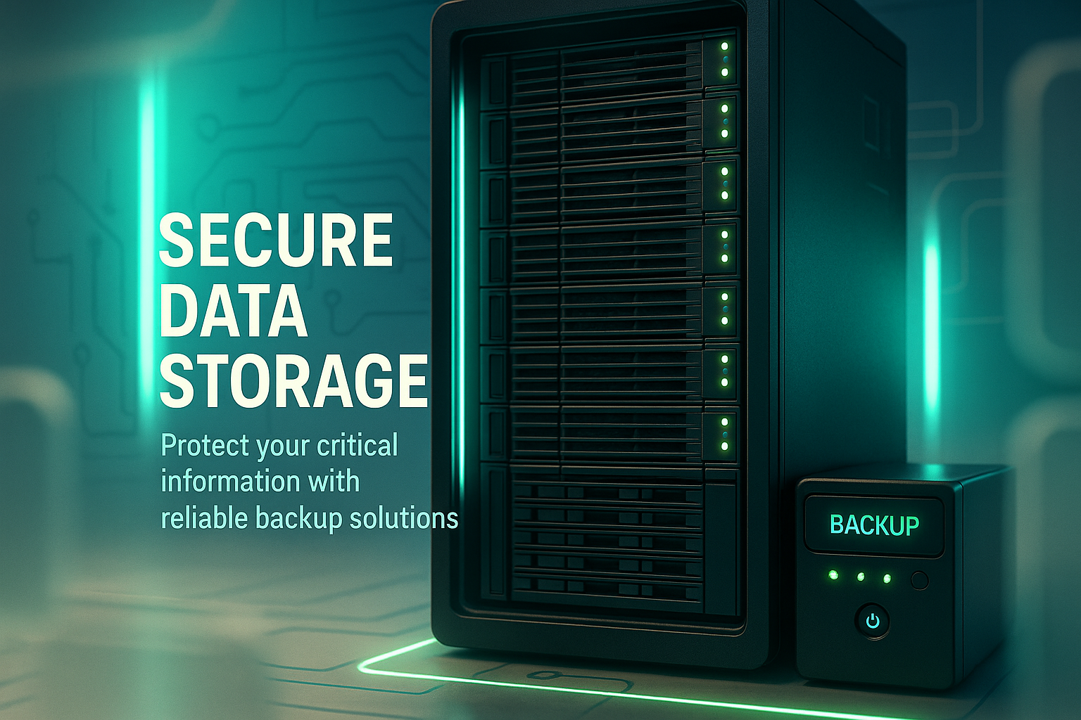 High-tech graphic showcasing a secure data storage server, emphasizing reliability and security in data backup solutions. Ideal for tech-related marketing.