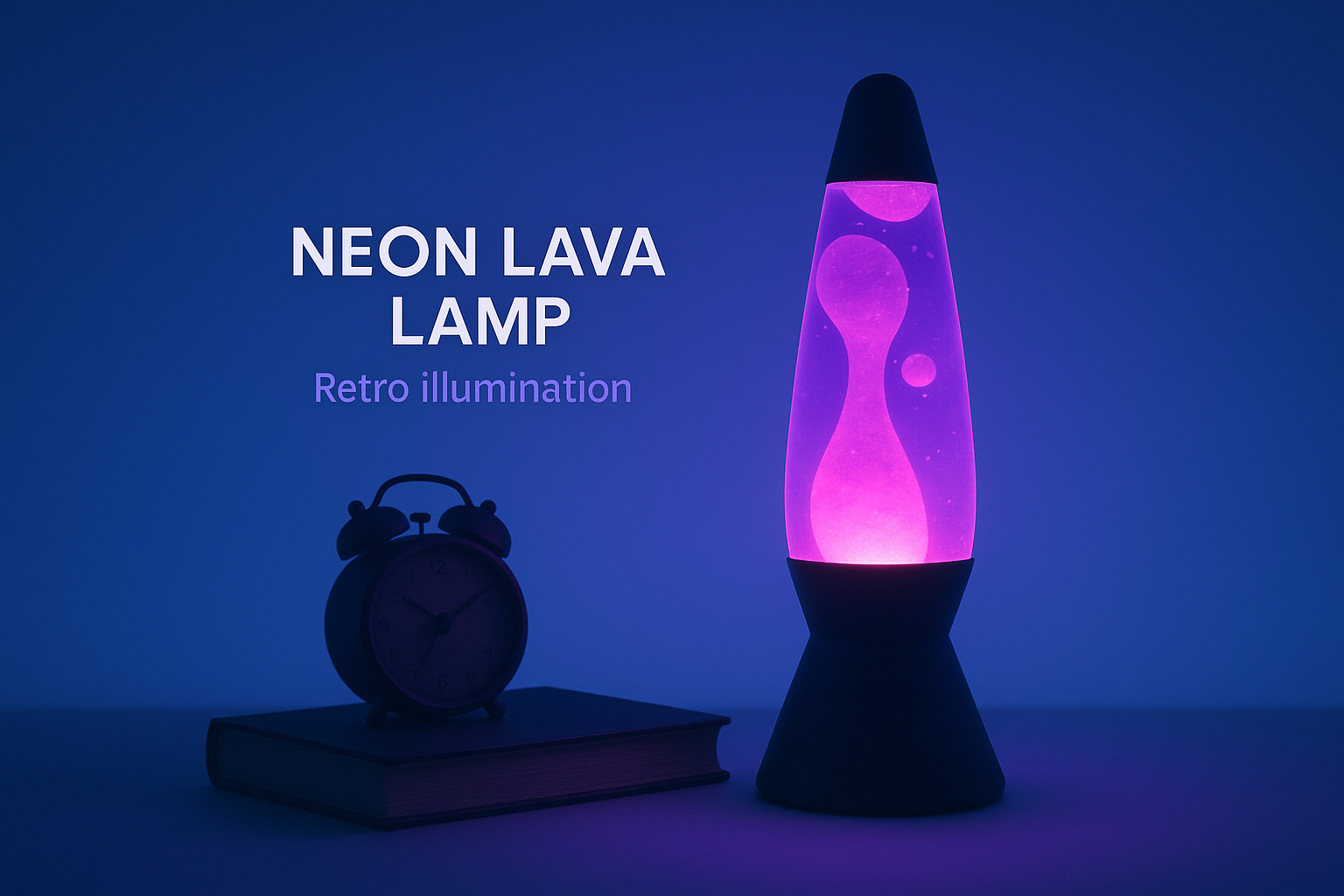 A vibrant scene featuring a neon lava lamp emitting a pink glow against a soft blue background. An alarm clock rests beside an open book, creating a cozy atmosphere.