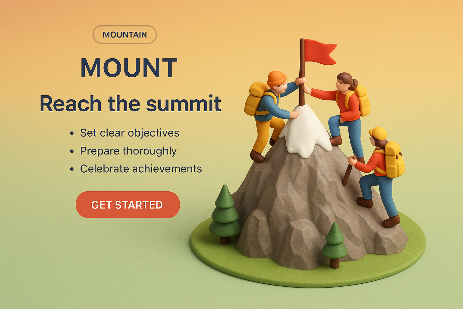 A vibrant 3D scene depicting small climbers reaching the summit of a mountain. The background features a smooth gradient, and an action button encourages interaction.