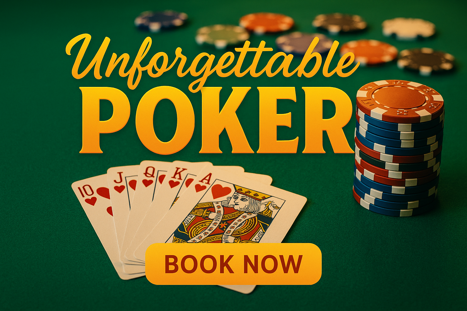 A lively poker scene featuring cards and stacked chips on a green felt table. The vibrant colors and clear text create an inviting atmosphere for poker enthusiasts.