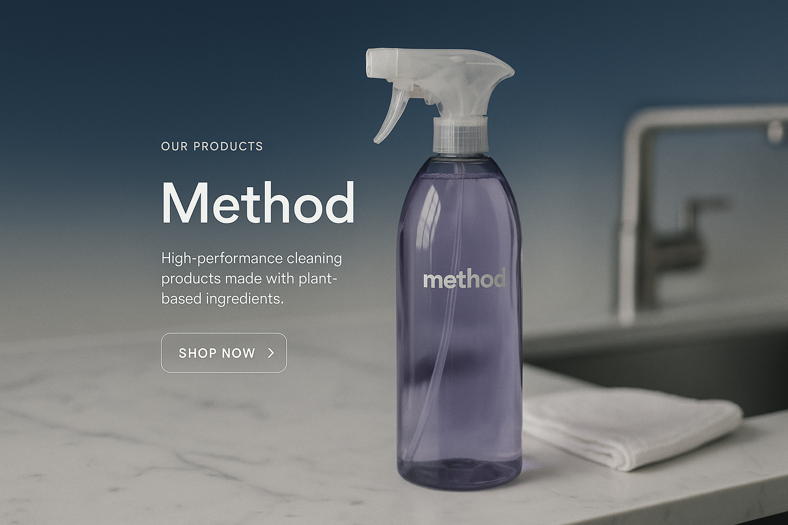 /Collection: /by davooda/Type: PNG/A visually appealing composition featuring a Method cleaning spray bottle on a marble surface. The background showcases a gradient from dark blue to white, enhancing the product's presentation.