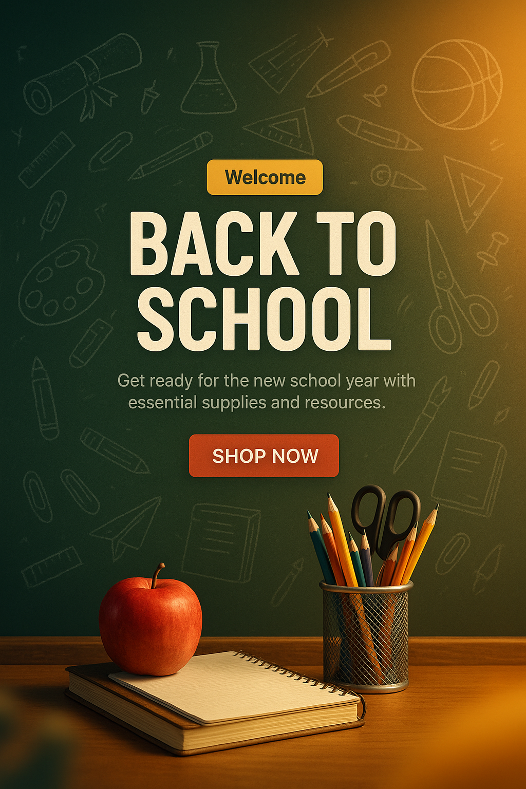This promotional banner features a warm design with school supplies, aimed at students and parents preparing for the new school year. The visual elements create an inviting atmosphere.