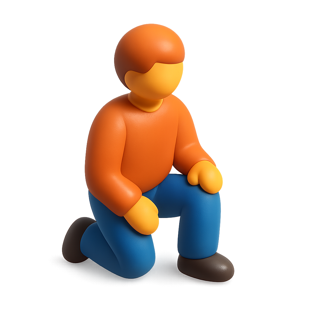 A stylized 3D icon of a person kneeling down, depicted in a vibrant color palette. The figure showcases a three-quarter view, with a smooth, isometric design and a transparent background.