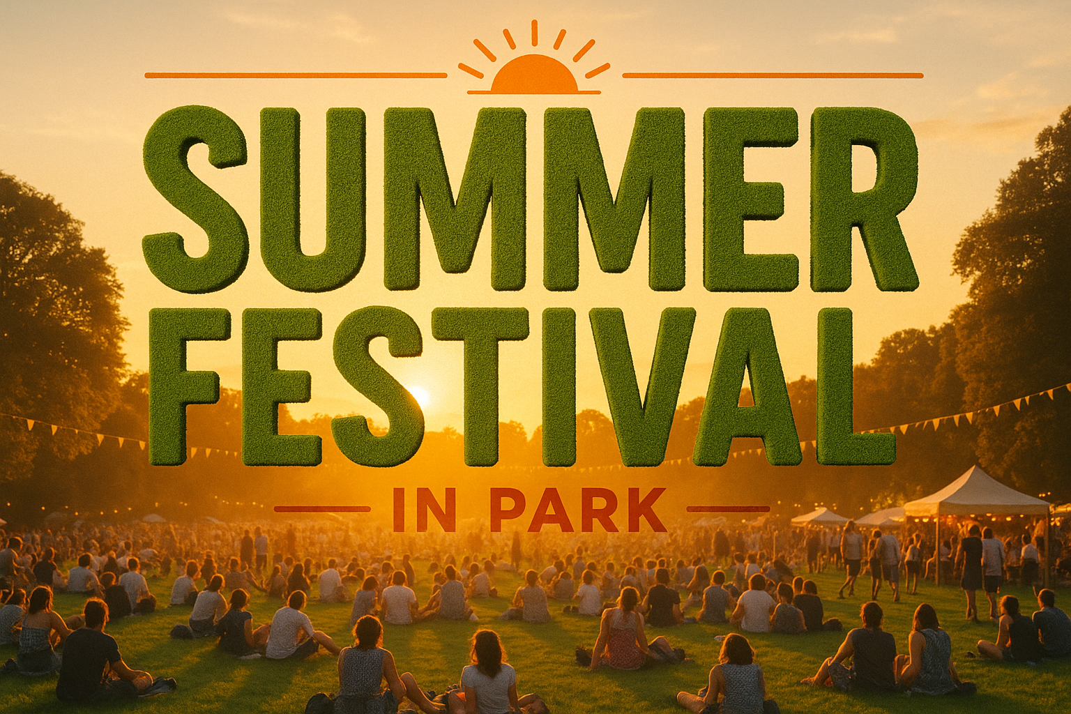 /Collection: /by davooda/Type: PNG/A lively summer festival scene captured in a park, featuring a large audience enjoying the event. The warm sunset tones create an inviting and festive atmosphere, ideal for promotional use in event marketing.