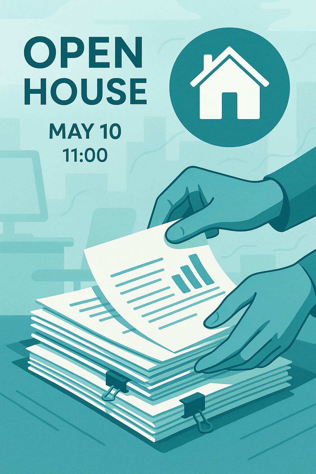 Illustrative graphic promoting an open house event, featuring a hand interacting with documents and a house icon, designed for real estate marketing.