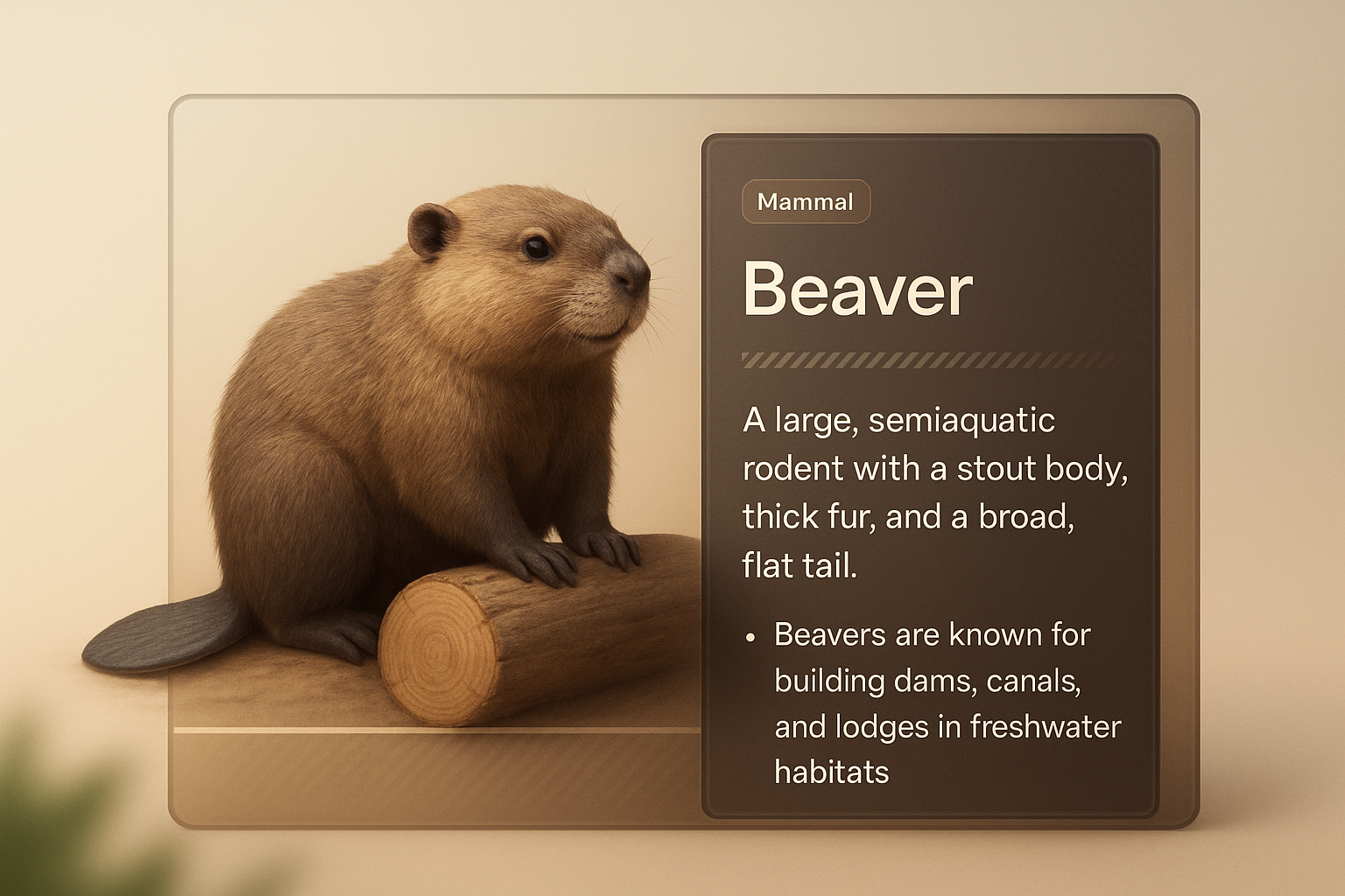 /Collection: /by davooda/Type: PNG/A 3D illustration of a beaver on a log, accompanied by stylish design elements. The image features a blurred background with text blocks that provide information about the beaver, all in a cohesive, light design.