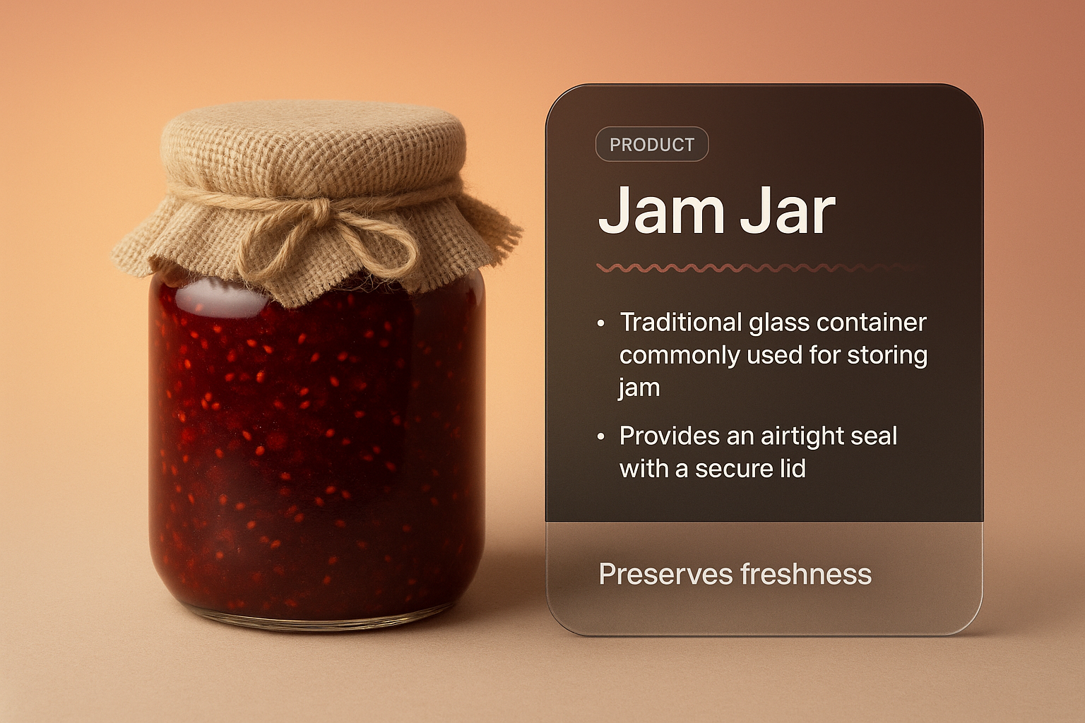 A realistic 3D illustration of a jam jar with a textured lid, alongside an informative overlay detailing its features. The background features a smooth gradient.