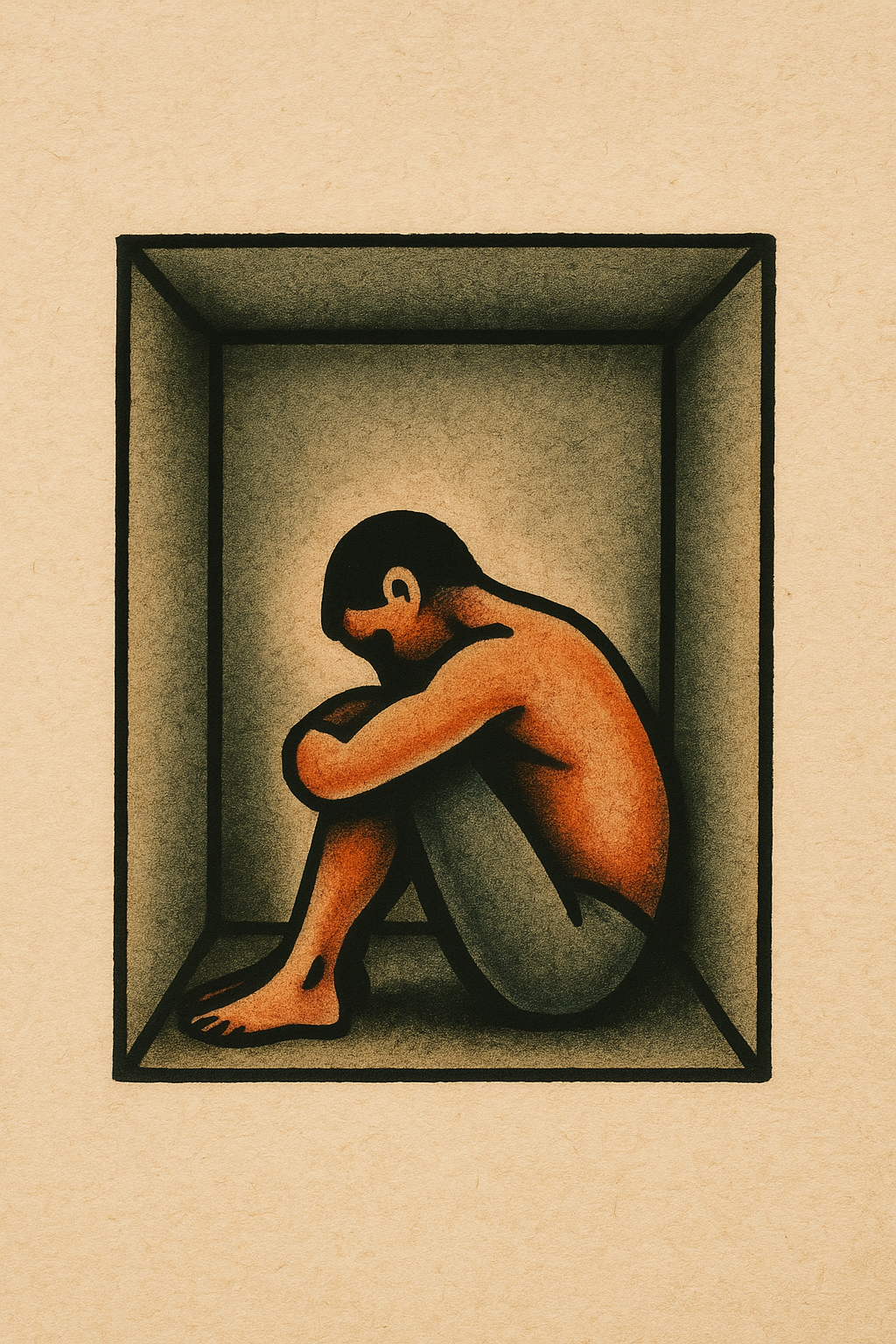 /Collection: /by davooda/Type: PNG/This tattoo sketch depicts a person sitting in a windowless, doorless room, conveying a sense of hopelessness. The artwork features a classic design in multiple colors against a light beige background.