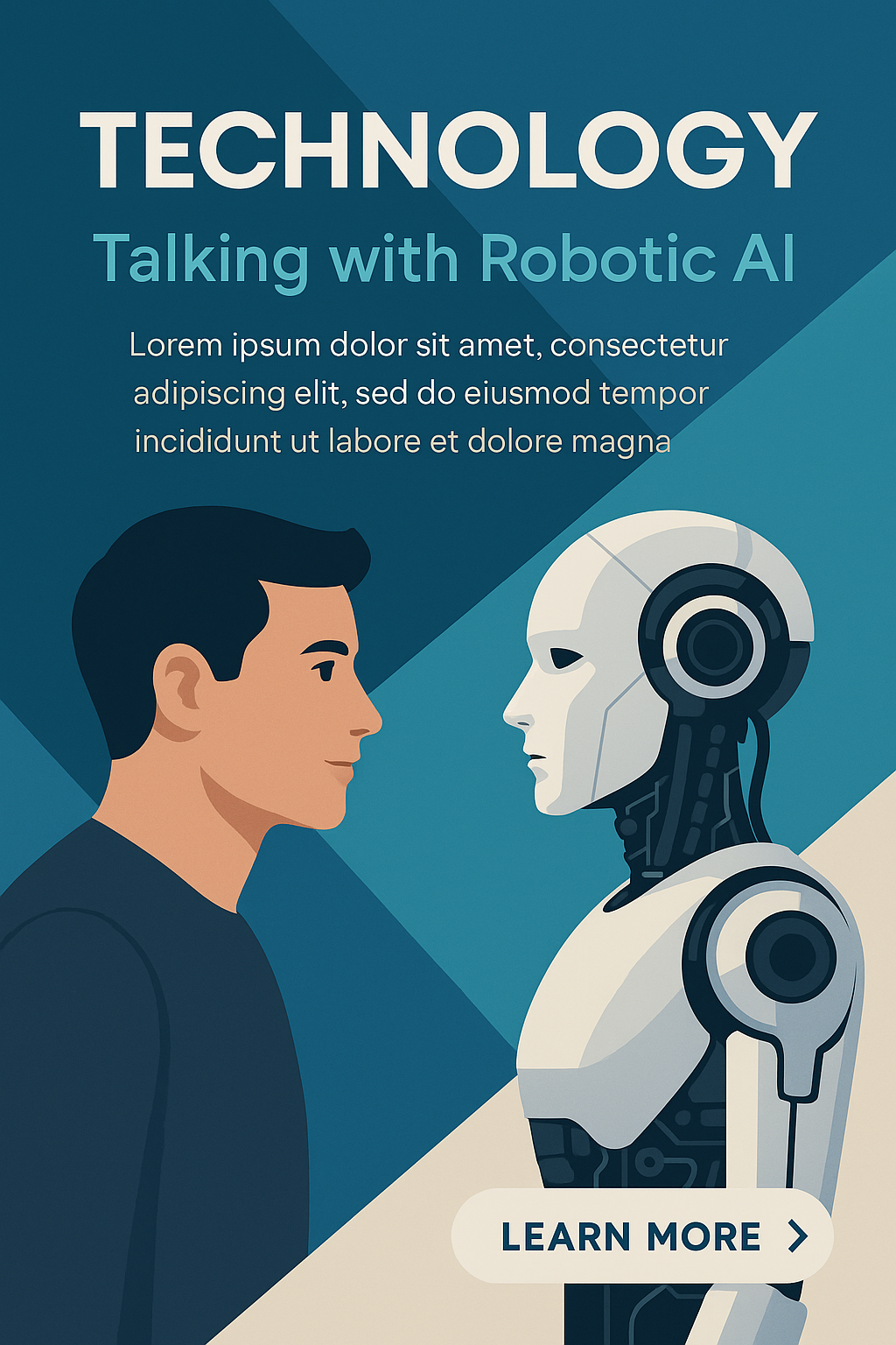 A futuristic design depicting a human and a robotic AI engaging in conversation. The layered composition features geometric shapes and a professional color scheme, emphasizing technology.
