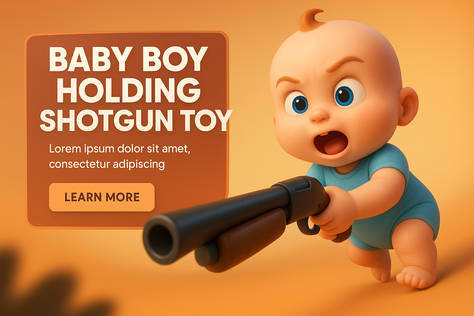 Vibrant cartoon illustration of a baby boy holding a toy shotgun, set against an orange background. Ideal for playful marketing or children's products.