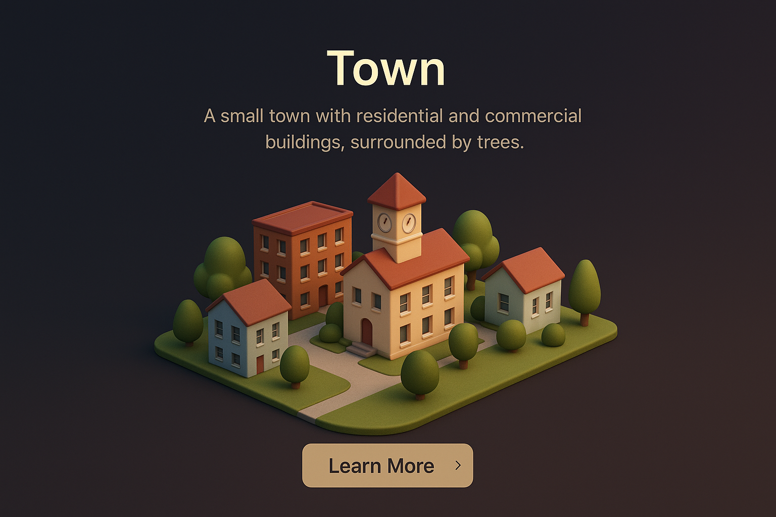 A detailed 3D scene depicting a small town with residential and commercial buildings, surrounded by trees. The design features a dark gradient background and a focus on realism.