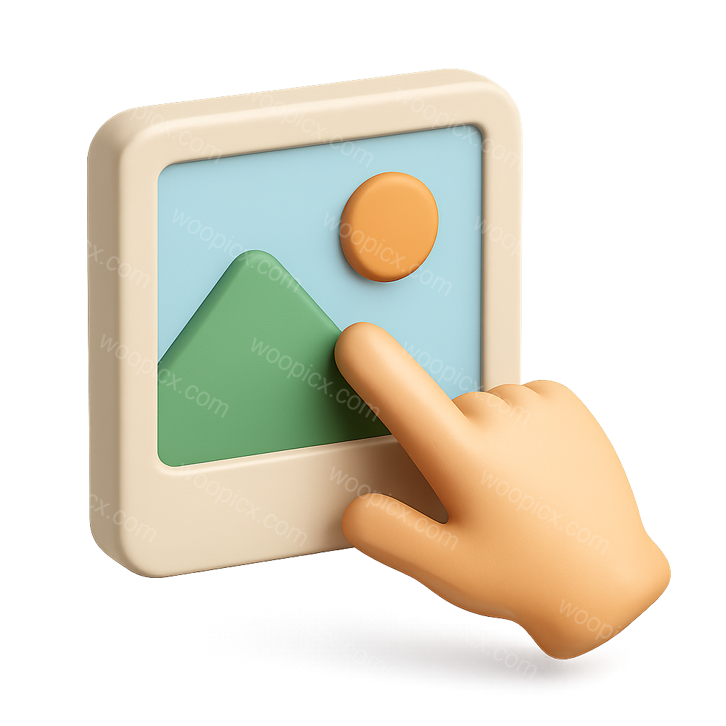 A stylized 3D icon depicting a hand pointing towards a picture frame. The frame contains a simplistic landscape with a mountain and sun, emphasizing a playful and modern design.