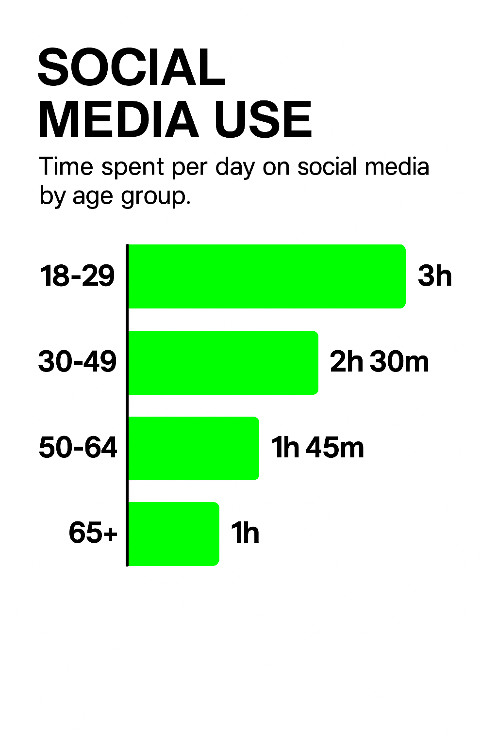 Simple infographic displaying time spent on social media by different age groups, using bold colors and clear typography for easy understanding.